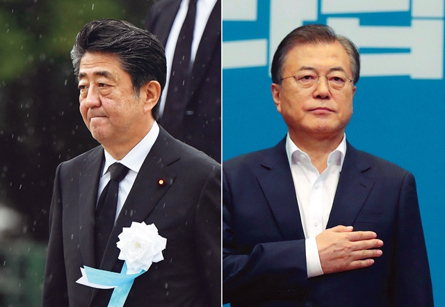 아베 신조 일본 총리가 8월6일 히로시마 평화기념공원에서 원폭 투하 74주기 연설을 마친 뒤 자리를 뜨고 있다(왼쪽). 문재인 대통령이 8월2일 오후 청와대에서 일본의 추가 경제보복 조치 대응 방안을 논의하기 위해 열린 임시 국무회의에 앞서 국민의례를 하고 있다. 청와대사진기자단