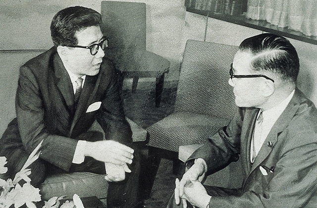 한일협정을 체결하기 하루 전인 1965년 6월21일, 이동원 외무부 장관(왼쪽)과 시나 에쓰사부로 외상이 이야기를 나누고 있다. 한겨레 자료