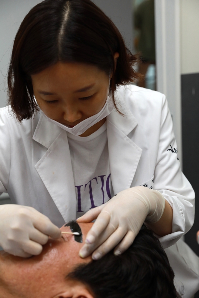 반영구 미용 전문 문신사 김은서(41)씨가 문신 시술을 하고 있다. 류우종 기자