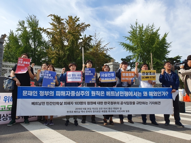 정부의 소극적인 입장 발표에 한국의 시민사회단체들은 반발했다. “국방부에서 보유한 한국군 전투자료 등에는 관련 내용이 확인되지 않고 있다”고 했지만 전쟁범죄 특성상 대규모 전쟁범죄가 한국군 전투 사료에 그대로 기재됐을 가능성이 작다는 게 시민사회단체들의 주된 입장이다. 전쟁범죄 사실을 공식 문서만으로 확인하는 것은 어렵다. 국가정보원(옛 중앙정보부)은 1969년 베트남전쟁 참전군인 3명에게 민간인 학살 사건을 조사한 자료의 ‘목록’조차 공개하지 않고 있다. 한국 정부가 진실을 밝히기 위한 범정부 차원의 노력을 기울였는지 의문이 들 수밖에 없다. 학살 사건 조사 목록도 공개 않으면서… 국방부가 회신에서 “공동 조사가 선행돼야 하나, 여건이 아직 조성되지 못한 상황”이라고 입장을 밝혔지만 실상은 한국 정부가 향후 베트남 정부와의 공동 조사에 대비한 일차적인 사전 준비나 선행 조사를 할 의지는 없어 보인다. 민주사회를위한변호사모임(민변)의 베트남전 진상 규명 태스크포스(TF)에 속한 임재성 변호사는 <한겨레21> 인터뷰에서 “정부의 첫 답변 내용이 기대에 크게 못 미치지만 두 번째, 세 번째 답변으로 이어지는 계기가 돼야 한다. 일본의 식민지 시기 불법행위에 대한 책임을 물으며 정부가 주장한 피해자 중심주의가 민간인 학살 피해자들에게 예외가 돼서는 안 된다”고 했다. ‘한국과 베트남 역사 문제의 정의로운 해결을 촉구하는 시민사회 일동’은 9월26일 오전 서울 용산구 국방부 앞에서 기자회견을 열어 한국 정부의 공식 입장을 규탄하는 연명서를 발표했다. 한베평화재단에서 제안한 연명서에는 60여 개 단체가 동참했다. 이들 단체는 연명서에서 “최소한 청원인 103명이 진술한 사건에 대해서라도, 민간 전문가가 참여해 국방부와 국가정보원이 보관한 관련 사료를 검토하고 관련 참전군인의 진술을 청취하는 정부 공식 기구를 설치할 것을 제안한다”고 했다. 베트남 피해자들에게도 시간은 없어 국방부의 회신서와 한국 시민사회단체들이 발표한 의견서는 베트남어로 번역해, 10월 초 학살 피해자 103명에게 전달할 예정이다. 대한민국 청와대에 청원서를 제출한 이후 한국 정부의 책임 있는 답변을 기대했을 고령의 민간인 학살 피해자들은 한국 정부의 소극적인 태도에 기약 없는 기다림을 계속해야 할지 모른다. 피해자들이 제출한 청원서 마지막엔 이렇게 쓰여 있다. “우리는 부디 한국 정부가 우리의 간절한 목소리에, 용기 내어 꺼낸 목소리에 응답해줄 것을 기대하고, 기다립니다.” 청원서에 서명한 학살 피해자들 가운데는 최고령의 93살 응우옌리도 있다. 1999년 민간인 학살 사건 피해자 9천여 명 가운데 100여 명의 목소리가 처음 세상에 알려졌을 때 증언자 중 한 명이었던 응우옌리는 이제 100살을 바라보고 있다. 이들이 기다릴 수 있는 시간은 길지 않다. 베트남에서 민간인 학살 피해자들을 만나 청원서를 받았던 구수정 한베평화재단 상임이사는 9월26일 기자회견에서 말했다. “직접 청원서를 내러 한국에 온 민간인 학살 피해자들이 당시 들고 다닌 손팻말을 들고 다시 국방부 앞에 섰다. 이들의 요구에 한국 정부가 책임 있는 답변을 할 때까지 우리가 베트남 민간인 학살 피해자들과 함께하겠다.” 조윤영 기자 jyy@hani.co.kr