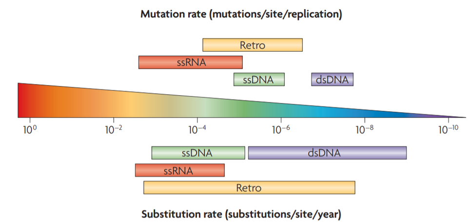 각 바이러스 종류별로 돌연변이율(Mutation rate)과 치환율(Substitution rate)을 비교한 그래프. 이중나선 DNA 바이러스(dsDNA), 단일나선 DNA 바이러스(ssDNA), 단일나선 RNA 바이러스(ssRNA), 레트로바이러스(Retro) 등에 따라 차이가 난다. 그래프에서 왼쪽으로 갈수록 돌연변이율이 높다. (그래프 출처 : 논문(doi: 10.1038/nrg2323)) 돌연변이율은 자연적 돌연변이가 발생하는 비율이고, 치환율은 생존 계보에 유전적 변화가 축적되는 비율이다. 이 글에서 서술한 ASFV의 돌연변이율은 정확히 말하면 치환율이다. 돌연변이율과 치환율에 대한 보다 자세한 설명은 논문(doi: 10.1038/nrg3564)에서 확인할 수 있다.