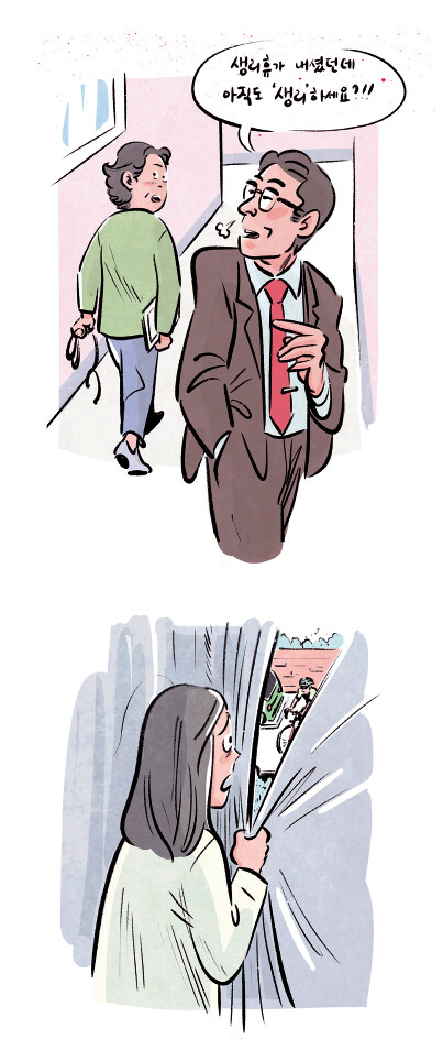 피해는 현재진행형이기도 하다. 20대 국회 비서 마은정(가명)씨에겐 피해자의 참담함이 고스란히 전해진다. 피해자가 상사의 속옷을 치우고 혈압을 재며 낮잠을 깨워야 했던 행위는 “단순 직장 갑질이 아니라 여성 비서라는 이유로 성별 역할을 비언어적인 방식으로 강요한 명백한 성희롱”이지만 “그도 지시가 떨어지면 ‘안 하겠다’고 말할 수는 없었을 것”이라 이해한다.