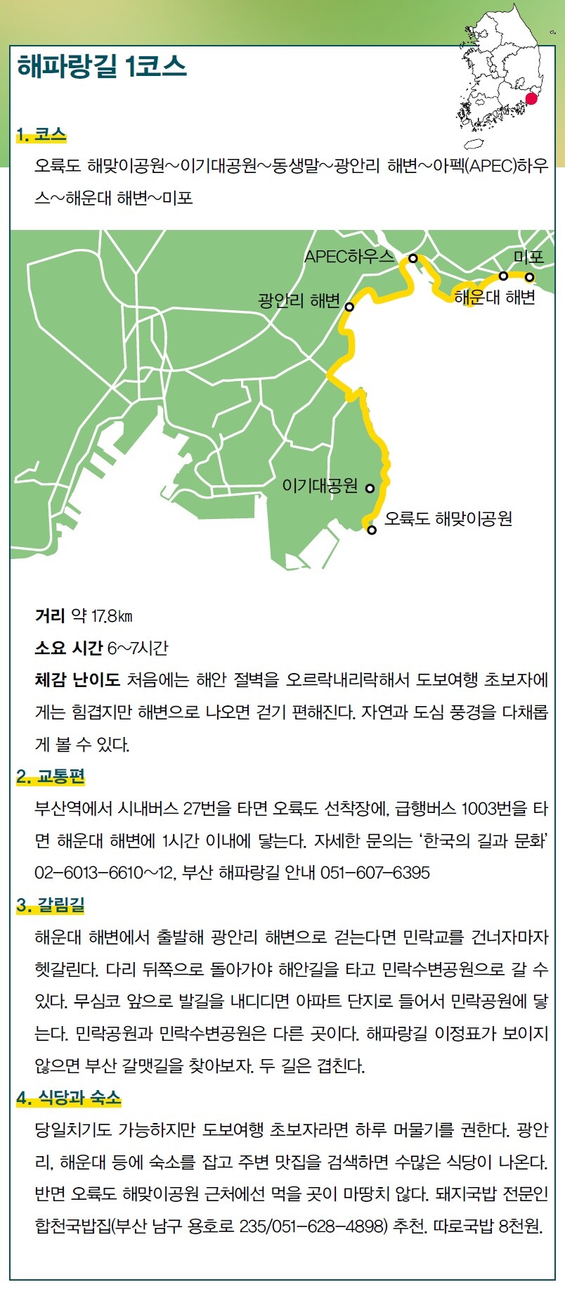 해파랑길 1코스는 올레길 이후 생겨난 걷기 여행길(걷기여행 사이트 ‘두루누비’ 소개 555개) 중에서 자연과 도심 풍경이 어우러진 특색 있는 곳이라 평가받는다. 시작점은 동해와 남해의 경계를 가르는 부산 오륙도 해맞이공원이고, 이기대공원과 광안리 해변, 영화의 거리, 해운대 해변으로 약 17.8㎞ 이어진다. 2016년 개통한 해파랑길 50개 코스(10개 지역, 750㎞) 가운데 경북 영덕 블루로드와 함께 큰 인기를 누린다. 4월25일 오전 11시께 도착한 오륙도 선착장에는 강풍(풍속 초당 8m)이 몰아쳤다. 발걸음을 옮길 때마다 몸이 휘청거릴 정도였다. 유채꽃이 만발했다는 오륙도 스카이워크를 들르지 않고 해파랑길 안내소 쪽으로 발길을 재촉했다. 해맞이공원 언덕에 올라오니 바람이 유순해졌다. 부산의 상징 오륙도도 한눈에 들어왔다. 오륙도는 부산 남구 용호동 앞바다의 거센 물결 속에 솟아 있는 6개 바위섬을 말한다. 밀물 때는 2개 섬(방패섬·솔섬)이 하나로 합쳐져 5개 섬이 된다고 해서 오륙도라는 이름이 붙었다.2021년 새로 단장한 이기대공원은 데크길이 가지런히 놓여 있었다. 이기대란 두 기생의 무덤이라는 뜻인데, 이들이 임진왜란 때 왜장을 끌어안고 바다로 몸을 던졌다는 설에서 유래했다. 꽃과 나무로 뒤덮인 숲이 해안 절벽을 따라 펼쳐지는데 그 속에서도 파도 소리는 귀가 먹먹할 정도로 철썩였다. 한 명 정도만 빠져나갈 수 있는 숲길에서 동행자와 이야기를 나누려면 소리를 질러야 할 지경. 화창한 봄날의 휴일이라 오가는 여행자도 많아 자연스레 홀로 걸으며 바닷가 풍경에 집중했다. 바다와 멀어졌다 가까워졌다 밀당하는 아름다운 해안 절벽을 따라 농바위, 밭골새, 치마바위, 어울마당, 구름다리를 지나고 이기대공원을 빠져나오자 안도의 한숨이 절로 나왔다. 다쳤던 발목을 중간중간 스트레칭했더니 4.8㎞를 3시간이나 걸었다. 광안리 해변으로 향하는 길(4㎞)은 차도, 자전거길과 나란했다. 걷기에 지쳤다면 자전거를 이용해도 좋을 듯하다. 군데군데 자전거 대여소와 카카오자전거가 보였다. 해파랑길 1코스의 중간 지점인 광안리 해변에 4시간 만에 도착했다. 선택의 순간이 왔다. 부산 요트경기장, 아펙(APEC)하우스(누리마루), 해운대 해변까지 나머지 9㎞를 내달릴 것인가, 아니면 하루 묵고 다음날을 기약할 것인가. 무릎이 아픈 동행자와 발목이 걱정스러운 나는 쉬기로 했다. 해파랑길을 안내하는 이정표. 2016년 개통한 해파랑길은 부산 오륙도 해맞이공원에서 강원도 고성 통일전망대(10개 지역, 50개 코스)를 잇는 750㎞의 동해안 걷기 여행길이다.