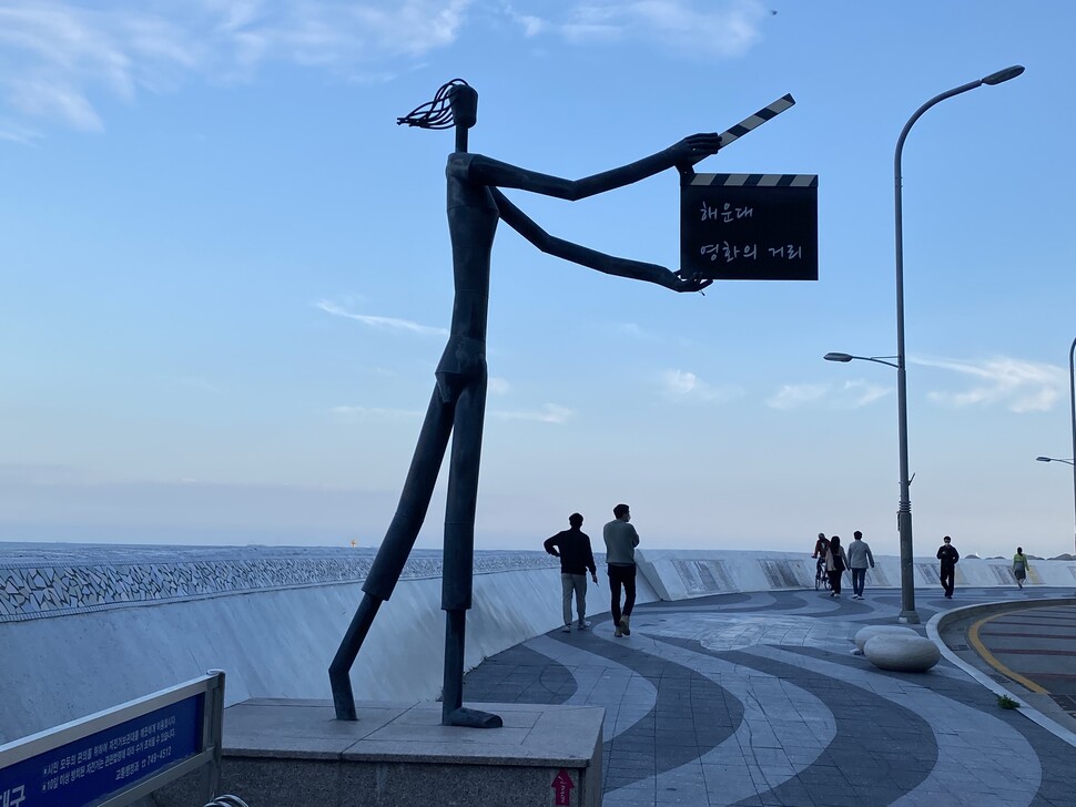 “산책로라며?”해안 절벽을 따라 숲길을 1시간30분 동안 앞서 걷던 동행자가 투덜댔다. 오래전 지리산에서 내려오다 무릎을 다친 그는 등산을 못한다. 오솔길과 데크로 이어진 숲은 험하지 않았지만 오르막 내리막이 반복되다보니 한계에 다다랐다. 그는 한쪽 다리를 절뚝거리기 시작했다. 2007년 제주 올레길이 처음 생겼을 때 나는 한 달간 제주도를 주말마다 들락거렸다. 해안을 따라 햇살과 바람을 맞으며 걷는 게 즐거웠고, 그 길 끝에서 만난 게스트하우스에서 잠드는 게 행복했다. 일터에서 부풀어 오른 고민으로 불면증에 시달릴 때라 그 길이 더없이 소중했다. 잠 못 드는 날이 다시 많아진 요즘, 길이 그리워졌다. 2020년 1월 발목 인대가 파열된 뒤 걷기를 멈춘 지 1년, 다시 걷기여행에 나섰다. 영화 관련 조형물과 벽화가 800m 해변길에 펼쳐지는 영화의 거리.