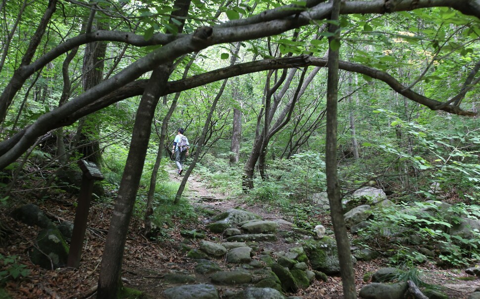 2020년 7월9일 경북 봉화군 ‘청옥산 명품 숲길’을 걷고 있는 서재철 녹색연합 생태조사팀 전문위원. 김선식 기자
