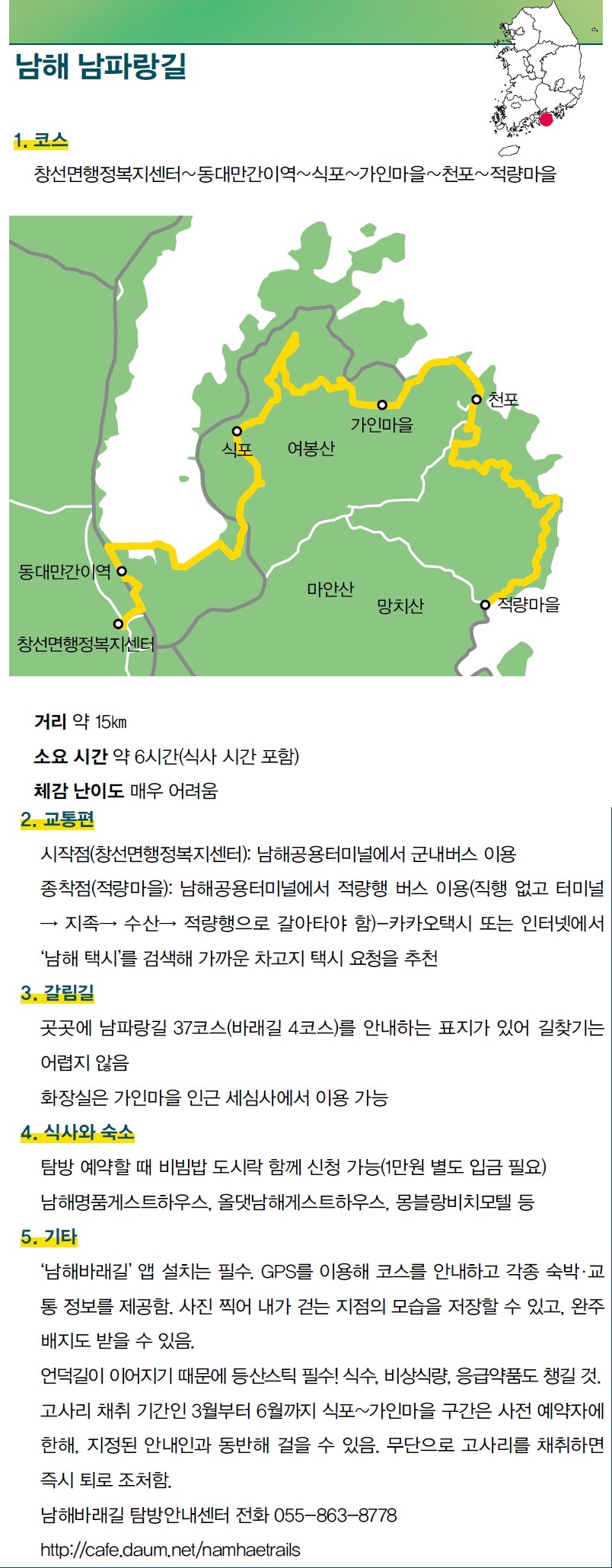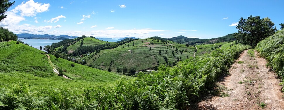 “직접 걸어보신 분들은 이탈리아 토스카나 지역을 닮았다고 해요.”(윤문기 남해관광문화재단 바래길 팀장) 남파랑길 37코스(남해바래길 4코스)를 걸어봐야겠다고 결심하게 한 건 남해바래길을 담당하는 윤문기 팀장의 한마디였다. 남해 여봉산을 끼고 고사리밭이 광활하게 펼쳐진데다 남해도 함께 만날 수 있어 ‘강력 추천’한다고 했다. 산과 바다를 동시에 볼 수 있다고? 귀가 솔깃했다. 걷기 여행을 안내하는 ‘두루누비’ 누리집에 들어가 코스를 살펴보니 15㎞로 제법 길었다. 게다가 난이도는 ‘어려움’. 처음인데 무리하는 것 아닐까 하는 걱정이 얼핏 스쳤지만, 꿈틀대는 호기심과 약간의 배짱이 우려를 살포시 눌렀다.
