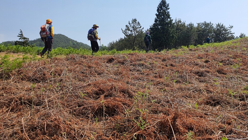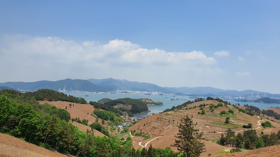구름이 잔뜩 낀 위장의 컨디션이 야속하리만치 날이 맑고 쨍했다. 출발지인 동대만간이역엔 제법 ‘프로 등산러’처럼 보이는 이들이 삼삼오오 모였다. 이날 길 안내를 맡은 조혜연 해설사에게 “체기가 있어 중간에 빠질 수도 있다”며 슬쩍 귀띔한 뒤 불안한 마음을 안고 동대만 둑길을 따라 걸음을 옮겼다. “이 길은 ‘봉황이 깃든다’는 여봉산을 넘어가는 코스예요. 여봉산 너머 식포마을에 사는 분이 고사리 포자를 가져와 심었는데 그게 점차 퍼져 고사리밭이 됐대요.”(조혜연 해설사)코스는 고사리밭을 품은 전반부(동대만간이역∼가인마을)와 바다 전경을 볼 수 있는 후반부(가인마을∼적량마을)로 구성된다. 전반부엔 두 번의 언덕(식포·언포)을, 후반부엔 한 번의 언덕(천포)을 넘어야 한다. 고사리밭 초입인 첫 언덕은 그럭저럭 오를 만했다. 다행히 행운의 신이 나를 완전히 비켜 간 건 아닌 모양인지, 요동치던 위장이 조금씩 가라앉았다. 이곳은 민둥산처럼 보일 정도로 갈색을 띠는데, 이미 수명을 다한 고사리가 만들어낸 색이다. 그 틈새로 초록빛 새 고사리가 삐죽 솟아 있다. 새 생명이 언덕을 뒤덮는 6월 말쯤엔 온통 초록색으로 물든다고 했다. “우와” 탄성이 이어진다. 갈색과 녹색이 어우러진 언덕은 어느 곳에서도 쉬이 보지 못한 풍경이다. 밭 곳곳에 실제로 고사리를 채취하는 주민들이 있다. 휴대전화를 수시로 꺼내 카메라 버튼을 눌렀다. “토스카나를 떠올린다”는 설명을 실감했다. 고비는 두 번째 언덕에서 찾아왔다. 지그재그로 이어진 가파른 언덕길로, 이 길의 하이라이트다. 참여자 대부분이 ‘등산용 스틱’을 들고 온 이유를 그제야 깨달았다. 패기 있던 발걸음이 점차 느려졌다. 가라앉은 줄 알았던 속이 다시 춤을 췄다. 조금씩 뒤로 처졌다. 다시 식은땀이 흘렀다. 영 딱해 보였는지, 가뿐하게 걸음을 옮기던 중년 남성 한 분이 기꺼이 등산스틱을 건넸다. 예의 있게 사양하자는 이성보다 생존 욕구가 앞서 덥석 받았다.