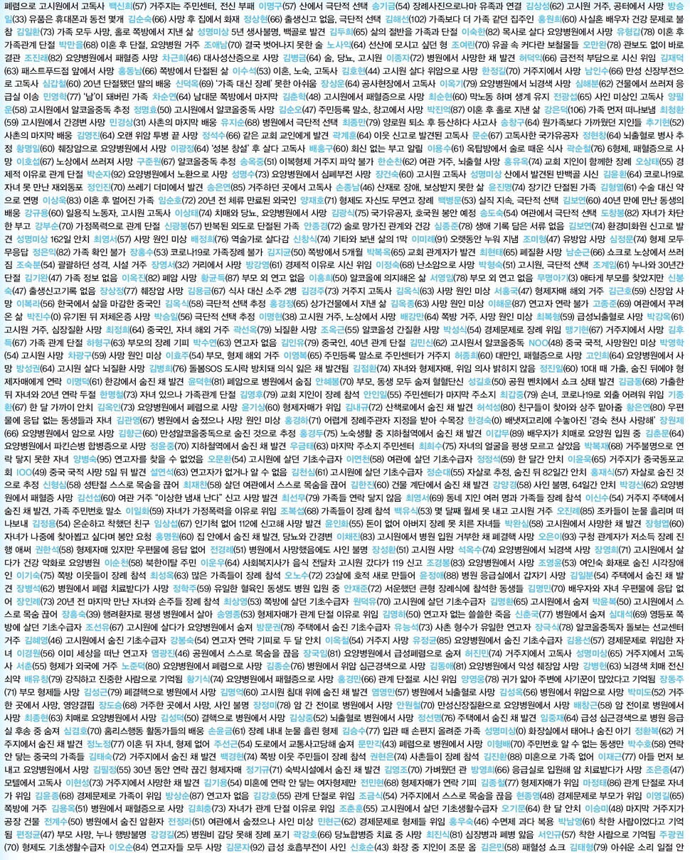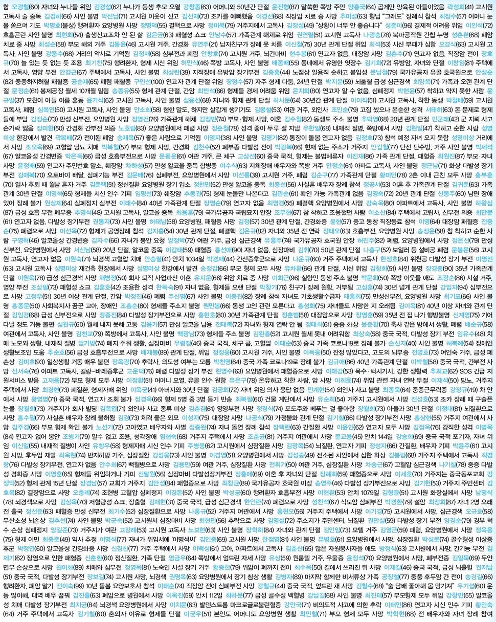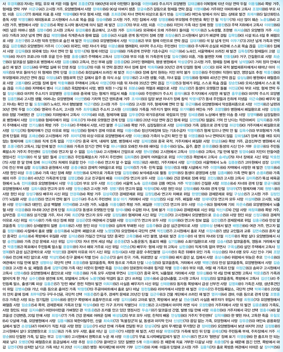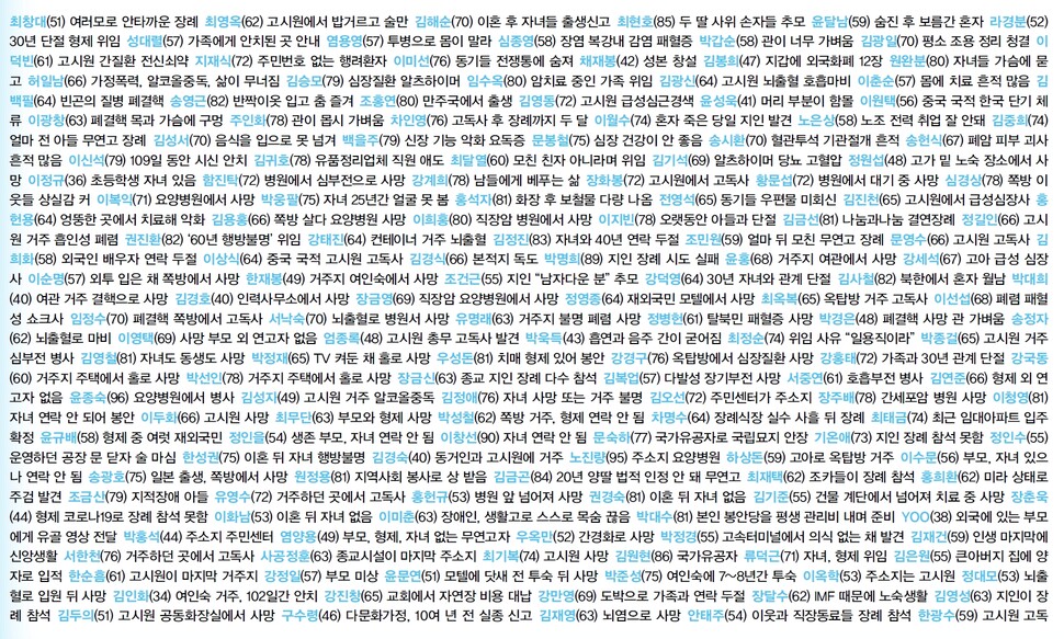 지난 609일(2020년 1월~2021년 8월) 동안 공영장례를 치른 서울 무연고 사망자 1216명의 사연을 전수조사했다. 서울시 공영장례를 지원하는 ‘나눔과나눔’이 그동안 ‘투명인간’ 1216명을 애도하며 꼼꼼히 기록한 내용이 바탕이 됐다. 비록 가난, 질병, 관계 단절 등으로 투명인간 같은 삶을 살았을지라도 그들도 누군가의 자녀, 배우자, 부모, 형제자매, 지인이었다는 점에서 우리와 다르지 않았다. 그들의 삶이 단순히 무연고 사망자 숫자 이상으로 기록되길 바라며 투명인간 1216명의 사연을 싣는다. 개인정보가 드러나지 않도록, 이름은 모두 가명으로 바꿨다.