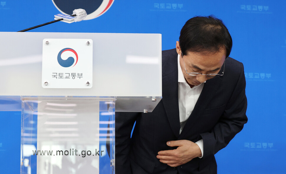 김오진 국토교통부 1차관이 8월3일 오후 세종시 정부세종청사에서 민간아파트 무량판 구조 조사계획과 관련한 브리핑에 앞서 인사하고 있다. 연합뉴스