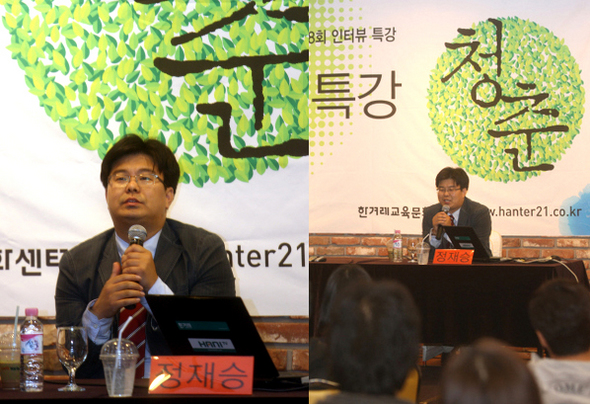 봄이다. 기다렸다는 듯이 캠퍼스엔 봄꽃이 흐드러지게 피었고 땅에는 새싹이 파랗게 돋아났다. 생명 가득한 계절, 20대 시절을 ‘청춘’이라고 부를 수밖에 없는 것은 인생에서 가장 싱그럽고 열정이 넘치는 시기이기 때문일 것이다. 그러나 카이스트 바이오및뇌공학과 정재승 교수의 인터뷰 특강 ‘불안하고 불온하고 불쌍한 청춘들의 뇌’ 강연이 열린 4월14일 저녁은 활짝 핀 벚꽃이 무색할 정도로 날씨가 쌀쌀했다. 중간고사를 앞둔 캠퍼스엔 알 수 없는 정적마저 감돌았다. 종잡을 수 없는 봄 날씨처럼 요즘 젊은이들은 “불안하고 불온하고 불쌍하다”. 이런 고민하는 청춘들을 위해 정 교수는 자신이 보낸 청춘과 지금 젊은이들의 청춘 이야기를 전하는 자리를 만들었다. 최근 카이스트 학생의 연이은 자살로 세간의 이목이 집중되는 상황에서 사회를 맡은 시사평론가 김용민씨는 카이스트의 현안에 대한 질문으로 입을 뗐다.
