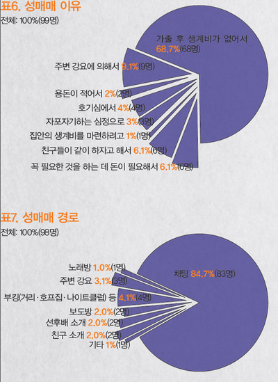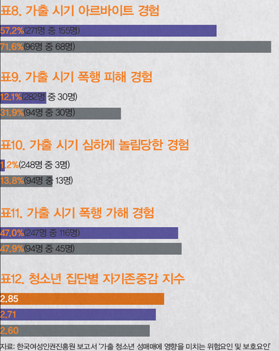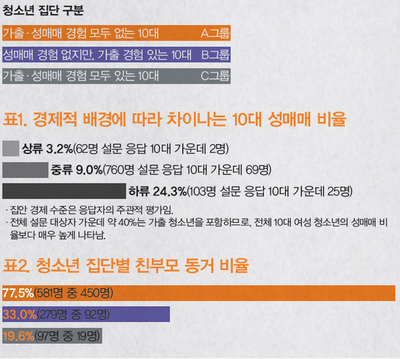 보고서를 보면, 가난은 여자아이들을 가출로, 성매매로 떠미는 변수였다(표1 참조). 설문에서 ‘자신의 집이 경제적으로 하류층에 속한다’고 답한 청소년이 성매매에 나설 확률은 상류층 출신 청소년보다 7배 이상 높았다. 또 하류층 청소년이 가출할 확률(74.6%)은 상류층 청소년(25.8%)보다 3배 정도 높게 나타났다.