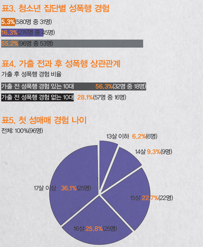 성폭행 경험도 가출 청소년의 동선을 좌우했다. 성폭행 경험은 C그룹이 A그룹보다 무려 10배 이상 높게 나타났다(표3 참조). 또 가출 전 성폭행 피해 경험은 가출 후 성폭행 피해에 강력한 영향을 끼쳤다(표4 참조). 보고서는 “조두순·김순철 사건 등 아동을 대상으로 하는 성범죄가 사회적 공분을 일으키고 있지만, 이와 같이 성학대를 당한 청소년들에 대한 우리 사회의 관심은 상대적으로 적다. 한국 사회에는 ‘청소년 성매매’에 대한 이중적 시각이 존재하기 때문이다. 즉, 성매매 청소년을 피해자로 인식하지만 일부에서는 ‘비행청소년’이라는 인식이 여전히 지배적이다”라고 분석했다. 이른바 ‘비행’의 원인은 보지 않고 결과만 본 채 아이들에게 손가락질한다는 말이다.