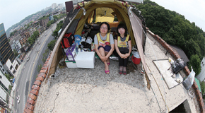 재능교육 해고노동자 오수영(왼쪽)·여민희씨가 지난 6월6일 서울 종로구 혜화동성당 종탑 위 농성텐트 앞에 앉아 있다.한겨레 강재훈