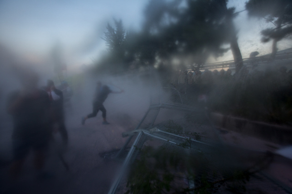 7월20일 현대차 울산공장 철제 담장을 사이에 두고 비정규직지회 조합원·희망버스 참가자와 현대차 사 쪽 직원들이 충돌했다. 사 쪽이 사진을 찍는 기자를 향해 물을 쏘고 있다.