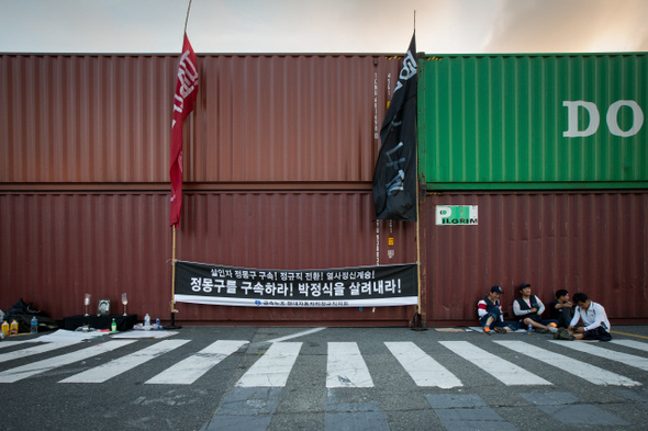현대차는 희망버스 참가자들의 진입을 막기 위해 정문 앞에 ‘컨테이너 산성’을 쌓았다.박승화