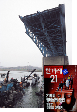 1994년 10월에 일어난 서울 성수대교 붕괴 사고. 하루아침에 무너져버린 한국형 개발독재의 상징이었다.옆은 창간호 표지.