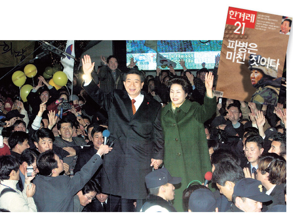 2003년은 노무현 대통령의 탄생과 참여정부의 첫걸음을 둘러싼 뉴스로 가득 찬 한 해였다. 노무현 대통령 부부가 인파를 향해 손을 흔들며 인사를 하고 있다.