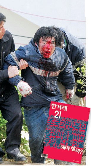 2006년 5월4일 미군기지 이전 예정지인 경기도 평택시 대추리에서 철조망 설치를 막던 한 대학생이 경찰과의 충돌로 피를 흘리고 있다.한겨레 김경호