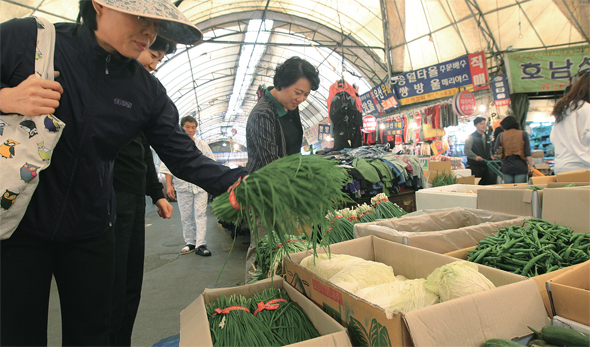 순간의 먹거리 선택이 평생 의료비를 좌우한다. 서울의 한 시장 채소가게에서 손님들이 장을 보고 있다.한겨레 김태형