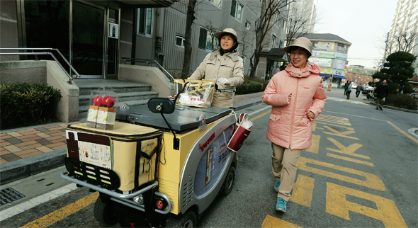 새 유니폼을 입고 나오자 정 여사님이 새 전동카트에 시동을 걸고 있었다. 이 전동카트 또한 회사가 도입하려는 신형 기기다. 야쿠르트를 배달·판매할 때 야쿠르트 아줌마에게 가장 힘든 일이 운반이었다. 발효유 1천여 개를 담은 손수레를 끌고 골목길을 오가다보면 팔과 허리가 끊어질 듯 아팠다. 눈이라도 오면 언덕길은 올라갈 엄두도 내지 못했다. 겨울 매출이 여름의 3분의 2에 그치고 겨울에 사표를 내는 야쿠르트 아줌마가 많은 이유였다. 이런 문제를 해결하려고 회사가 지난해 손수레를 전동모터를 장착한 카트로 교체했다. 올해는 더 업그레이드한다. 전동차에 냉·온장고를 더한 신형 전동카트를 선보인 것이다. 새로운 전동카트를 정 여사님이 지난 2월부터 시범 운행 중이다.