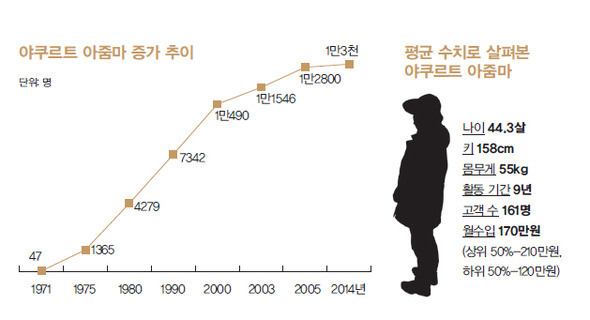 ‘신선함’은 야쿠르트 아줌마의 생명이다. 1971년 한국야쿠르트가 고객에게 직접 제품을 배달하고 영업하는 야쿠르트 아줌마 제도를 최초로 도입한 까닭이다. 당시만 해도 냉장고가 있는 집이 드물었고 유산균은 저온 관리가 필수였다. 생산부터 판매까지 유통 과정을 최소화할 수 있는 방법이 야쿠르트 아줌마의 방문판매였다. 47명으로 시작해 현재는 1만3천 명이 활동한다. 야쿠르트 아줌마는 하루에 평균 550개의 발효유 제품을 판다. 금액으로 따지면 30만원이다. 대형마트에서 점포당 발효유의 평균 매출액은 214만원. 야쿠르트 아줌마 7명이 대형마트 1개 매출을 올리는 셈이다. 발효유 분야에서 한국야쿠르트가 점유율 약 50%를 유지하는 비결이다.