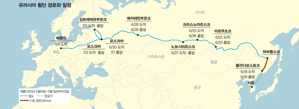 여행 일정은 이렇습니다. 인천∼블라디보스토크 1박∼열차 내 3박∼이르쿠츠크(환바이칼 철도) 2박∼크라스노야르스크 1박∼열차 내 1박∼노보시비르스크∼열차 내 1박∼예카테린부르크 1박∼열차 내 1박∼모스크바 1박∼열차 내 1박∼상트페트르부르크∼열차 내 1박∼모스크바∼열차 내 1박∼베를린 2박∼인천(지도 참조). _편집자