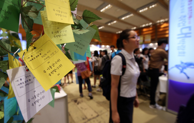 지난 9월4일 서울 삼성동 코엑스에서 열린 ‘2015 고졸성공 취업대박람회’ 한켠에 청년들의 소망을 담은 메모지가 주렁주렁 매달려있다. 정용일 기자
