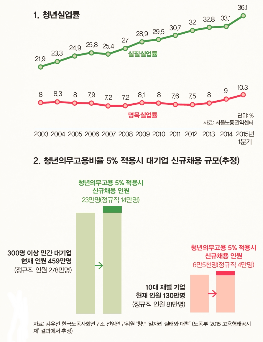 규원씨처럼 요즘 청년 대부분의 가장 큰 고민은 일자리 문제다. 2015년 1분기 만 15~29살 청년층의 명목실업률은 10.3%(청년실업자 44만9천 명)로 역대 최고치를 기록했다. 서울노동권익센터가 집계한 실질실업률은 36.1%로 더 심각하다(표1 참조). 실질실업률은 잠재적인 실업자, 구직활동을 중단하고 졸업 유예 상태인 청년층까지 포함해 집계한 수치다. 청년 10명 중 서너 명은 일자리를 구하고 싶어도 취업하지 못하는 처지라는 뜻이다.