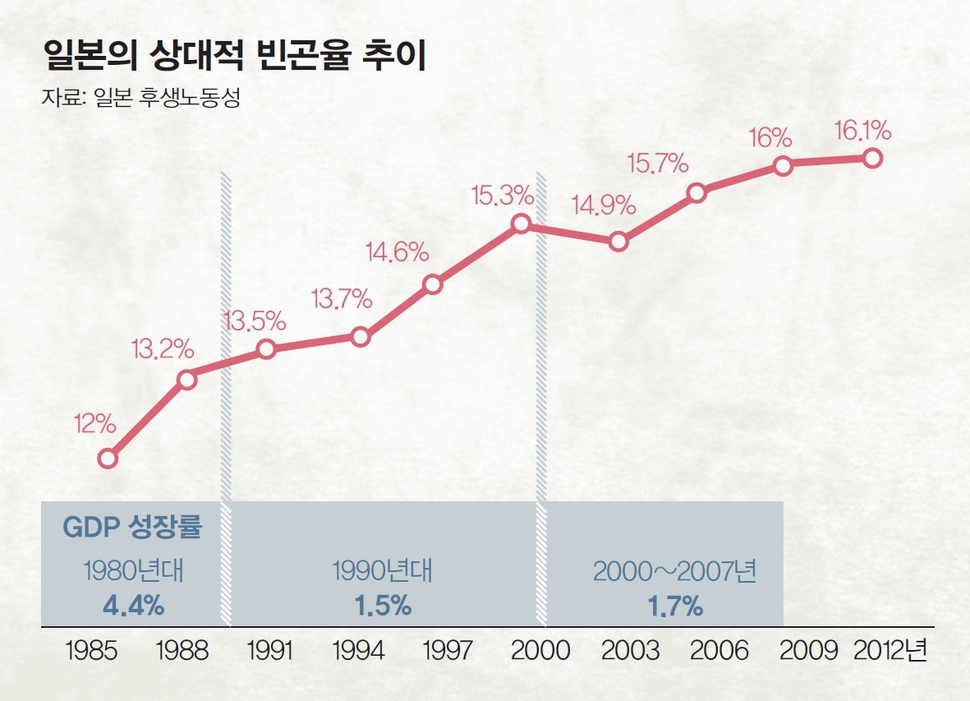 1990년대 파견법이 개정돼 파견 대상 업종이 늘어난 뒤, 1994년 20.3%에 불과했던 일본의 비정규직 비율은 최근 38%까지 늘었다. 중위소득 50% 미만인 계층이 전체 인구에서 차지하는 비율을 뜻하는 상대적 빈곤율도 1985년 12%에서 꾸준히 상승해 2009년 이후로는 16%를 넘어섰다(그림 참조). 지난해 한국의 상대적 빈곤율은 17.9%로, 한국과 일본의 빈곤율 순위는 경제협력개발기구(OECD) 34개 회원국 가운데 10위권 이내에서 매년 앞서거니 뒤서거니 한다.