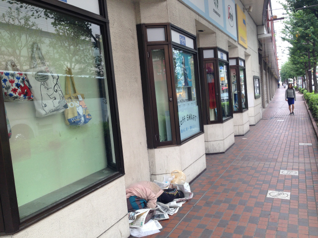 일본 도쿄 신주쿠 거리에 있는 백화점 앞에서 신문지를 깔고 자는 노숙자. 일본의 상대적 빈곤율은 16%대에 이른다.