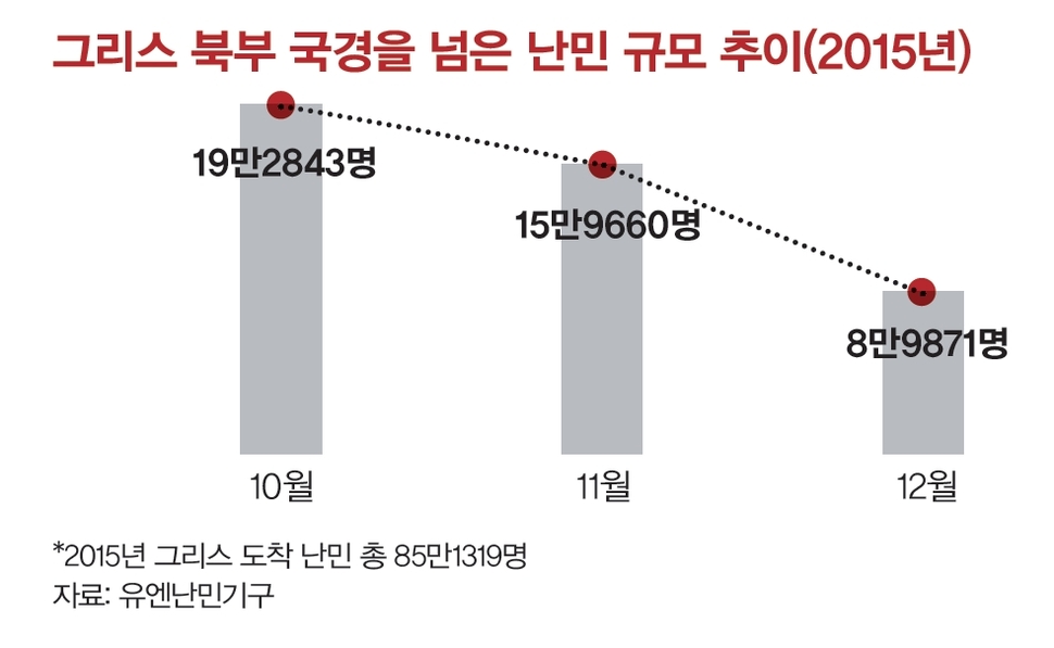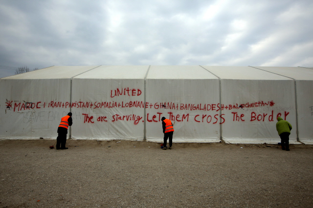 그리스 쪽 땅에 지은 10여 개의 천막들은 텅텅 비어 있었다. 난민들은 철조망 앞에서 마케도니아로 넘어갈 순서를 기다렸다. 마케도니아 경찰은 1명씩 줄을 서라고 소리쳤다. 자하라(38·가명)도 6살 아들 손을 꼭 잡고 줄을 고쳐 섰다. 자하라는 아테네에 있는 난민들과 표정이 다르다. 그는 이곳까지 온 게 믿기지 않는다. “너무 좋다”는 말만 반복했다.