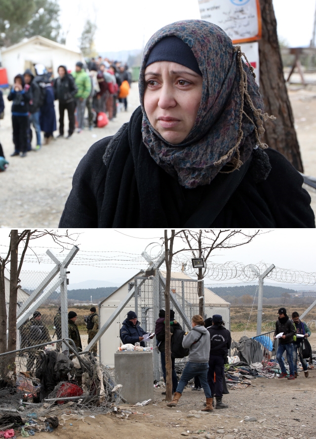 팔레스타인 시리아인 자하라(38·가명)는 2015년 12월11일 그리스 북부 국경지대에서 경찰이 가로막자 울음을 터뜨렸다(위쪽). 그가 우는 사이 다른 시리아·이라크·아프가니스탄 난민들이 국경을 지나 마케도니아로 넘어가고 있다(아래쪽).