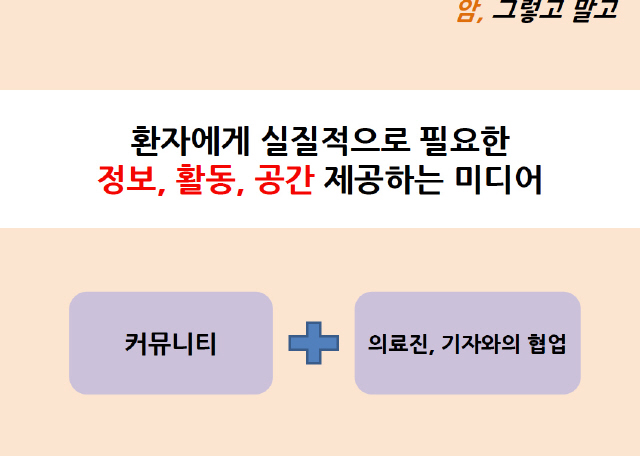 ‘암, 그렇고말고’는 암환자와 가족을 향한 참여형 미디어를 꿈꾼다. 병원이나 질병별로 카테고리를 세분화해서 의료진과 질의응답하고 교류할 수 있는 온라인 미디어 공간을 만드는 게 목표다.