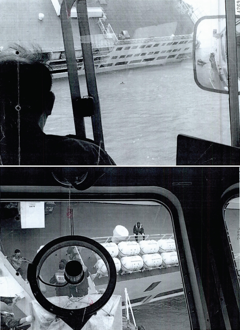 그 시각 세월호는 70도 이상 기울어져 바닷물이 배 안으로 쏟아져 들어오고 있었다. 10시17분 진도VTS가 123정 정장 김경일에게 전화해 해경 지휘부의 지시를 전했다. “문이 잠겨 있어서 문을 못 열어서 승객들이 탈출을 못하고 있다고 합니다.” “위에서 지금 가셔서 문을 열어주라고 합니다.” 10시29분 서해해경청 상황실은 다시 문자상황보고시스템으로 묻는다. “여객선 갇힌 학생 구조되었는지 여부?” 아무도 응답하지 않았다.