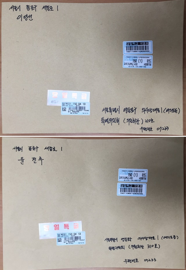 이영선·윤전추 두 행정관의 청문회 불출석사유서 우편 봉투. 청와대는 두 행정관의 출석요구서를 대리 수령했고, 불출석사유서 역시 같은 필체로 보이는 봉투에 적어 국회로 보냈다. 더불어민주당 도종환 의원실 제공