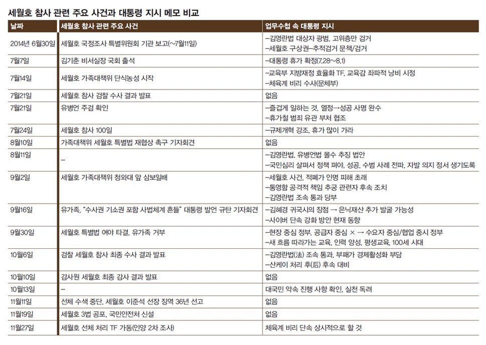 <한겨레21>이 입수한 김영한 전 대통령비서실 민정수석의 업무수첩(2014년 6월14일~2015년 1월9일)에는 대통령의 지시 사항으로 보이는 ‘領’(령, 18회) 또는 ‘統’(통, 1회)이란 표기가 19차례 등장한다. 열흘에 한 번꼴이 채 안 된다. 이 가운데 직간접적으로 세월호 관련 언급을 한 건 5번에 그친다. 그나마 ‘유병언’ 등 간접적 언급을 제외하면 ‘세월호’란 말을 직접 한 것은 딱 2차례다. 6월30일 ‘領’에 ‘세월호 구상권-추적검거 문책/검거’라는 메모가 있고, 9월2일 ‘領’에 ‘세월호 사건-적폐가 인명 피해 초래’가 적혀 있다.