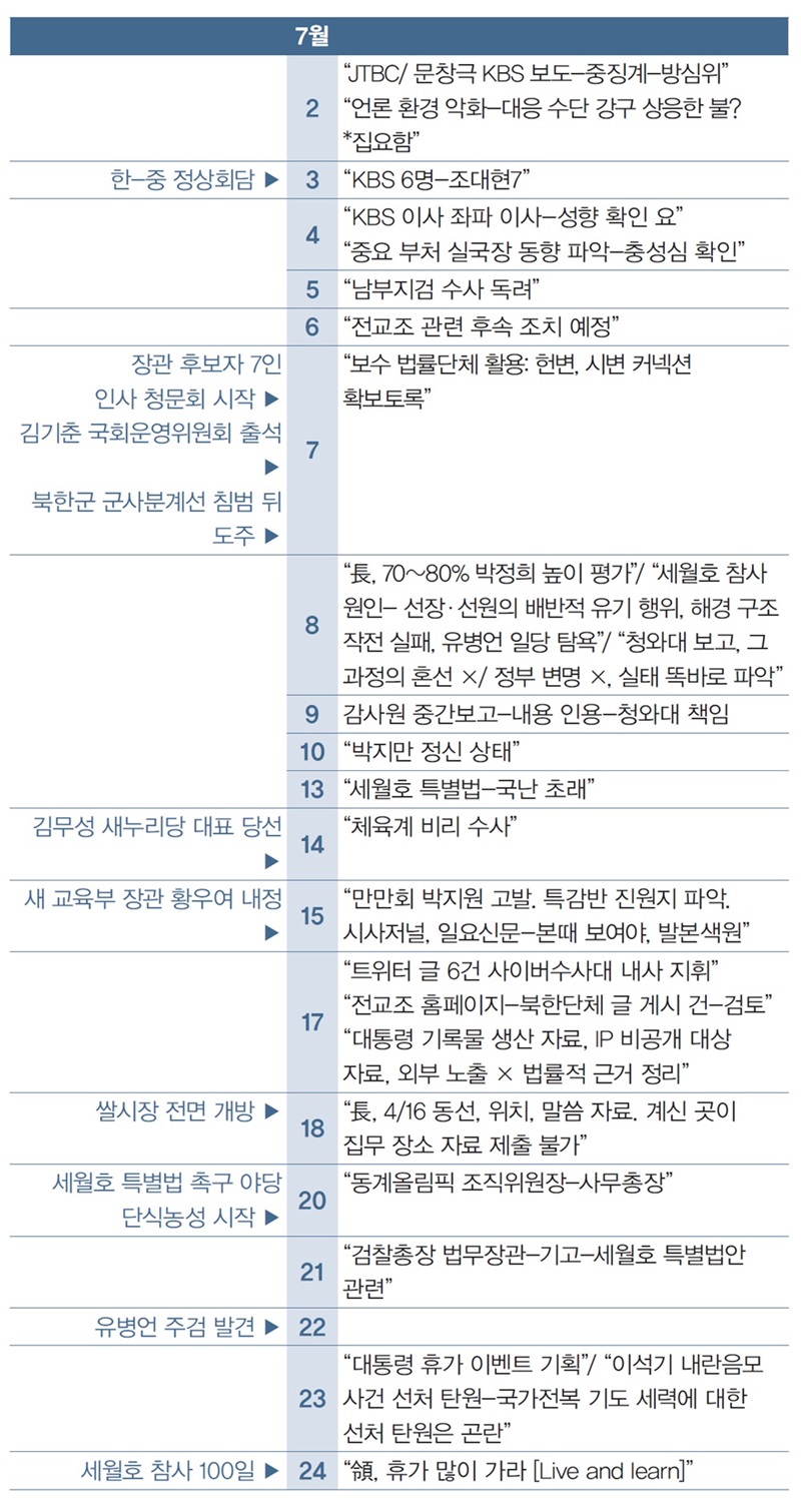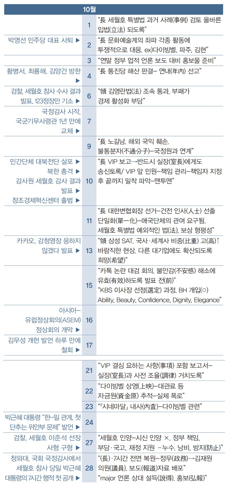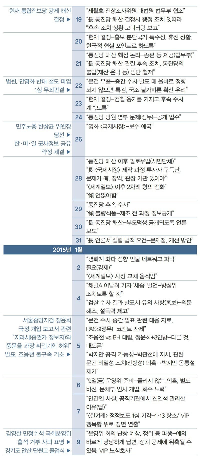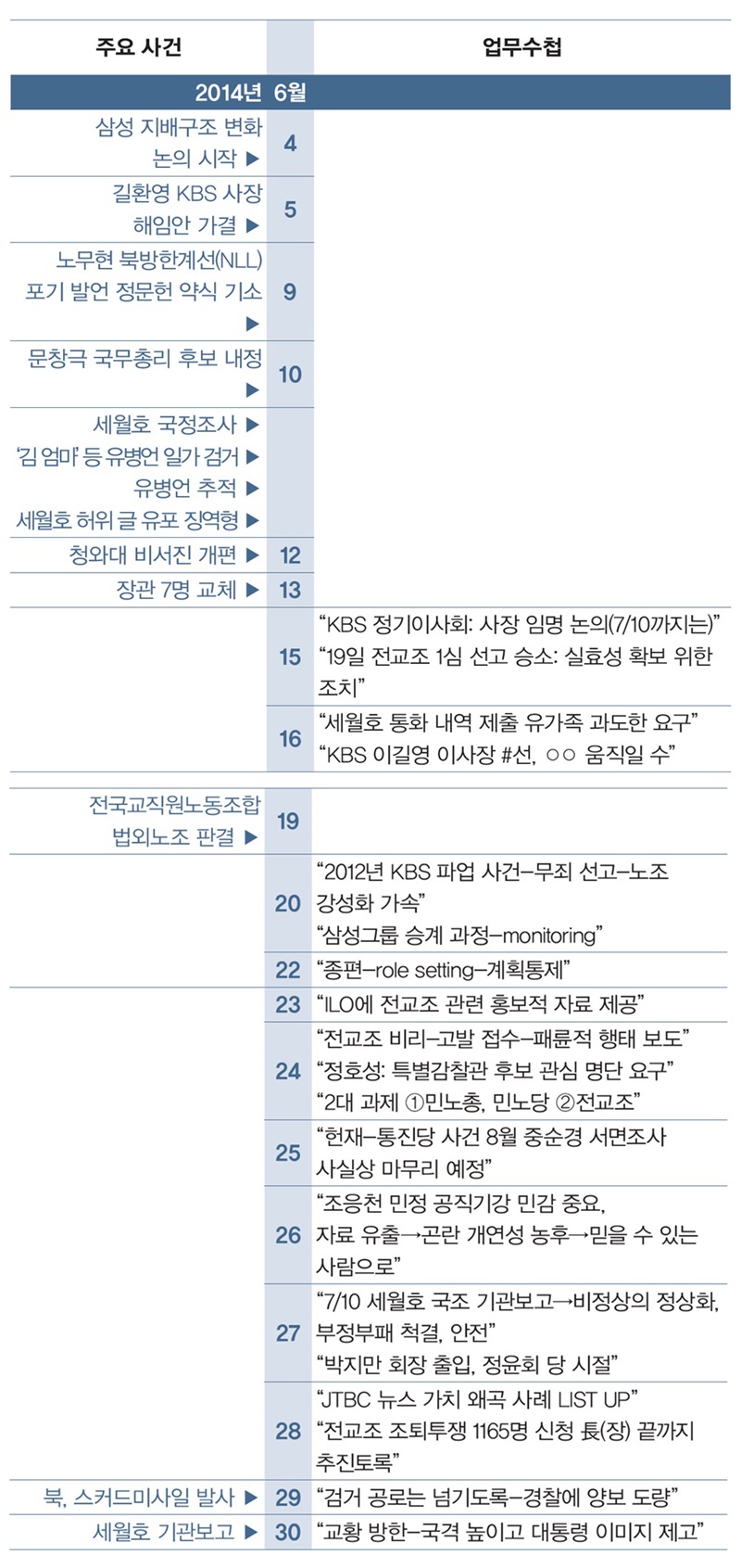 그 내용을 최대한 간추려 아래에 정리했다. 김 전 수석의 업무수첩에 기록된 2014년 6월부터 2015년 1월까지 8개월여 동안 발생한 주요 사건과 당일 청와대가 어떤 논의를 했는지 비교 분석했다. 한눈에 보아도 ‘국가적 사건’과 청와대의 관심이 엇박자였다는 것을 확인할 수 있다. 예컨대, 북한군이 군사분계선을 침범하고 도주한 날, 청와대는 ‘보수 법률단체 활용: 헌변, 시변 커넥션 확보토록’이라며 보수 세력 동원을 의논했다.