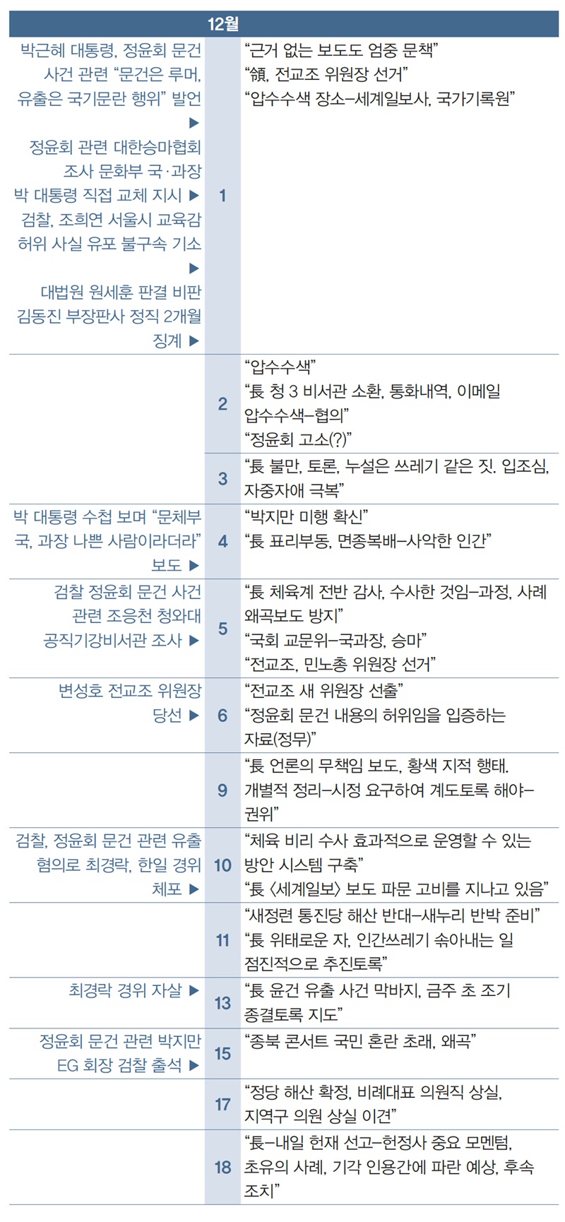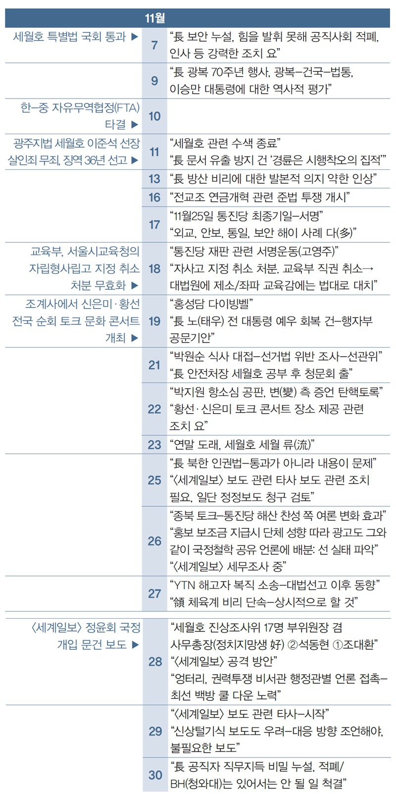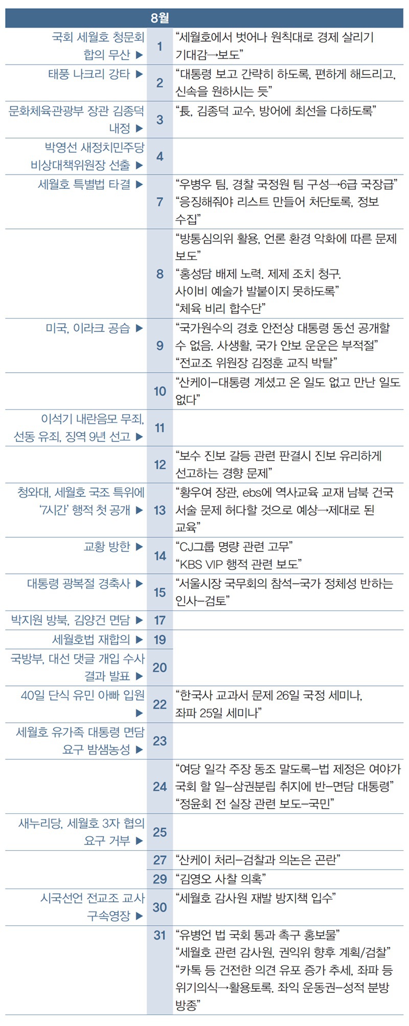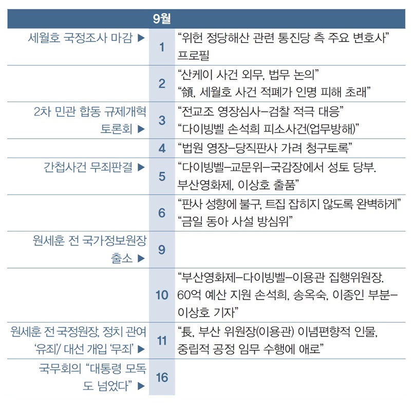 그 내용을 최대한 간추려 아래에 정리했다. 김 전 수석의 업무수첩에 기록된 2014년 6월부터 2015년 1월까지 8개월여 동안 발생한 주요 사건과 당일 청와대가 어떤 논의를 했는지 비교 분석했다. 한눈에 보아도 ‘국가적 사건’과 청와대의 관심이 엇박자였다는 것을 확인할 수 있다. 예컨대, 북한군이 군사분계선을 침범하고 도주한 날, 청와대는 ‘보수 법률단체 활용: 헌변, 시변 커넥션 확보토록’이라며 보수 세력 동원을 의논했다.