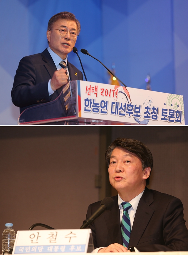 문재인 더불어민주당 대선 후보(위쪽 사진)가 4월13일 오후 서울 강서구 한국방송(KBS) 아레나홀에서 열린 한국농업경영인중앙연합회 대선 후보 초청 토론회에서 연설하고 있다. 안철수 국민의당 대선 후보가 4월6일 오전 서울 중구 프레스센터에서 열린 관훈토론회에서 패널들의 질문에 답하고 있다. 한겨레 강창광 기자, 한겨레 김태형 기자