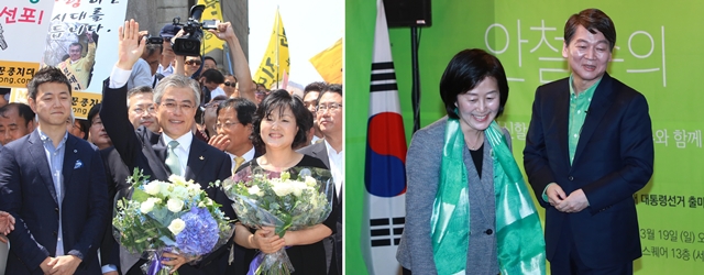 2012년 6월17일 당시 문재인 민주통합당 상임고문이 서울 서대문구 독립공원 독립문 앞에서 대선 출마를 밝히려고 부인 김정숙(오른쪽)씨와 함께 연단으로 향하다 지지자들에게 손을 흔들어 인사하고 있다(위쪽 사진). 지난 3월19일 서울 종로구 마이크임팩트 스퀘어에서 열린 안철수 전 국민의당 대표의 대선 출마 선언식에 부인 김미경씨가 참석했다. 한겨레 이정우 선임기자, 사진공동취재단