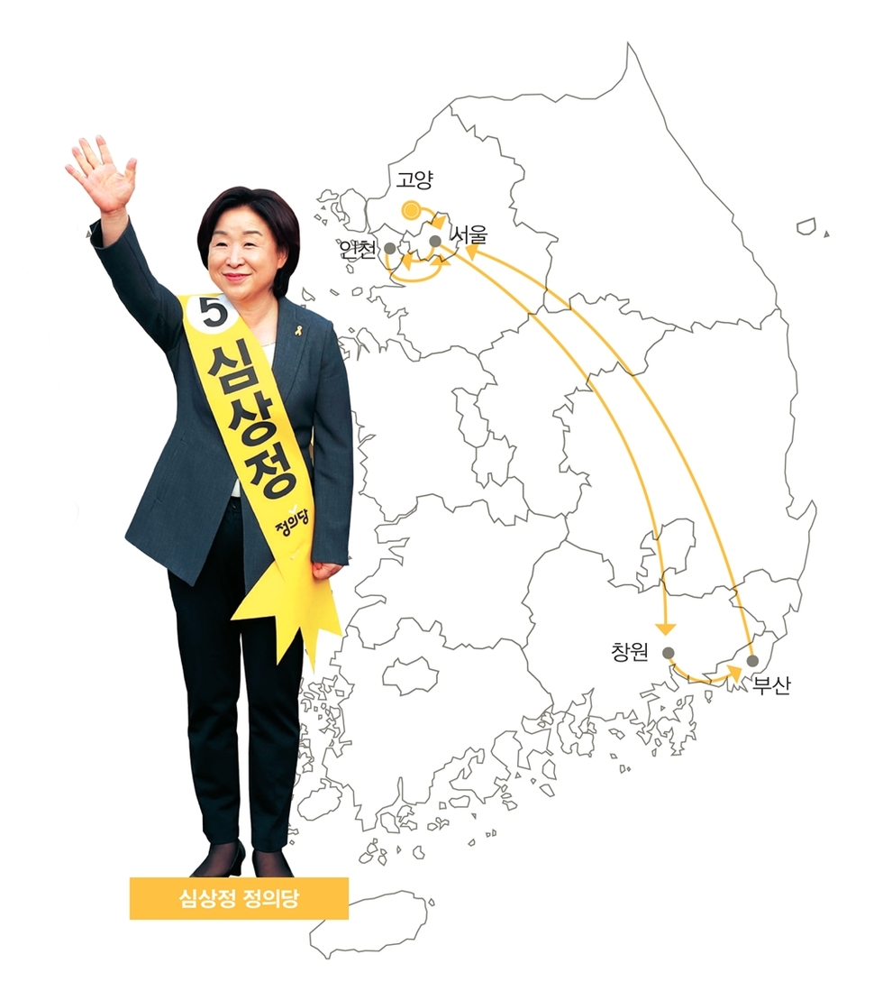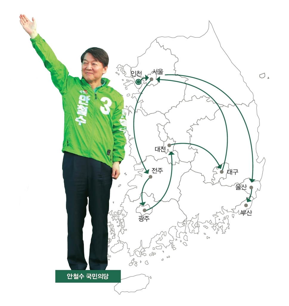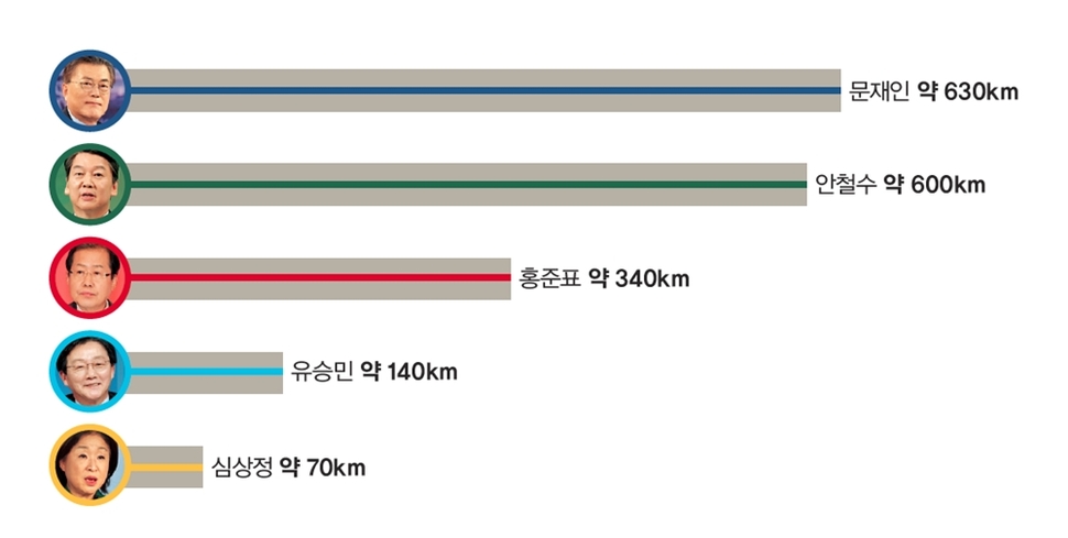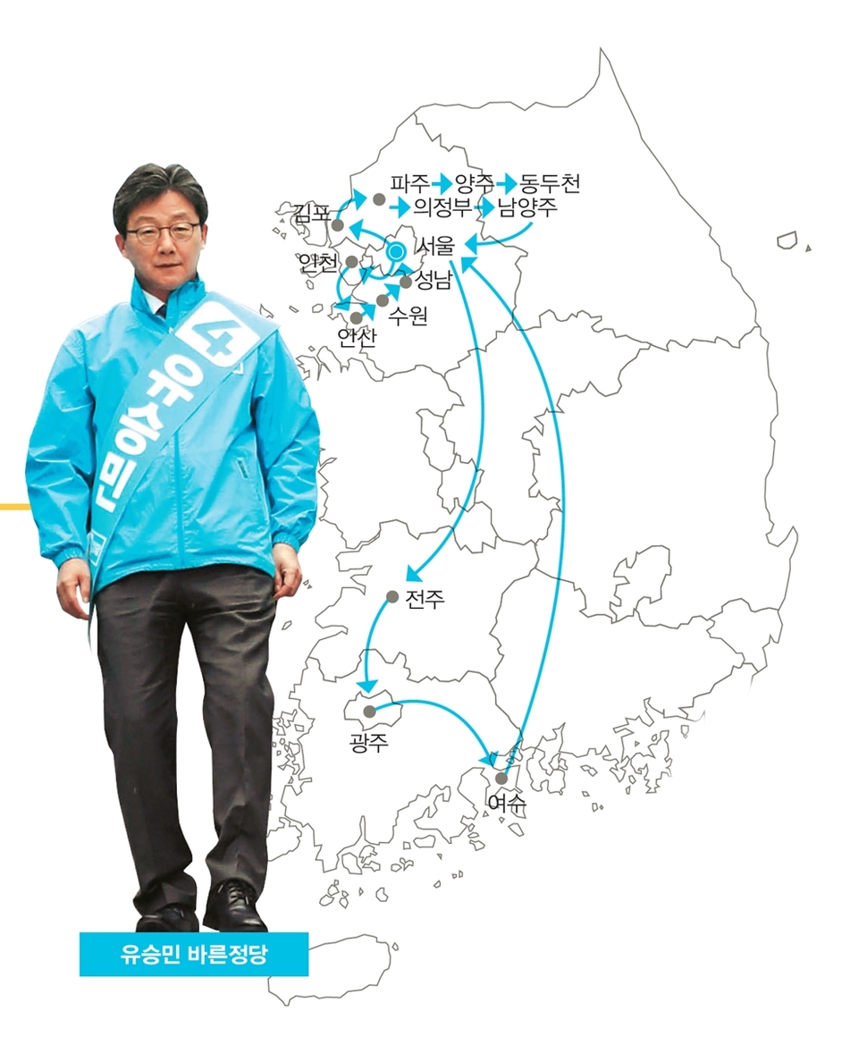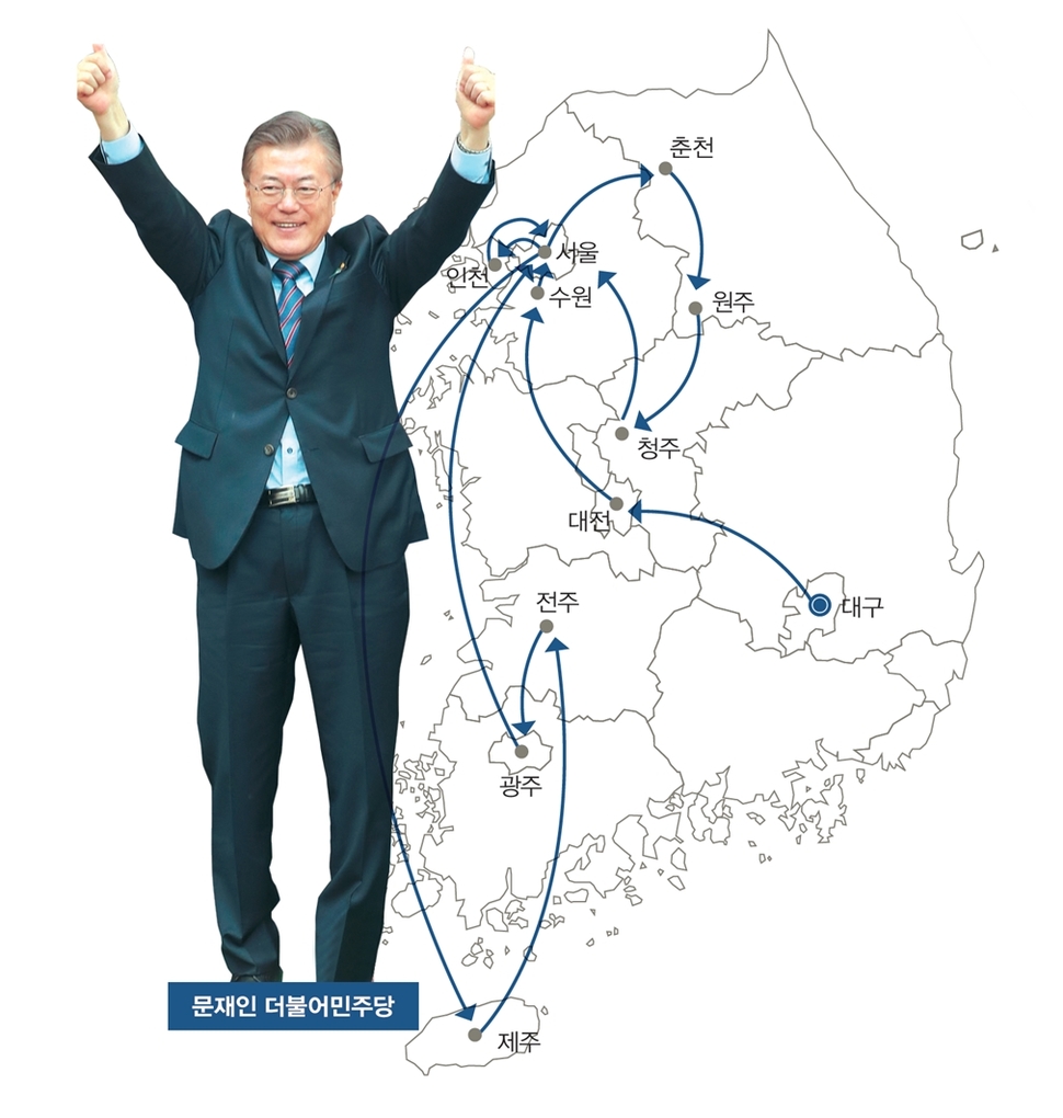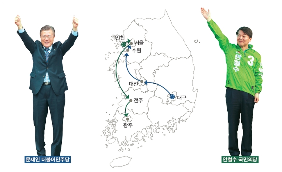 문재인 더불어민주당 후보는 선거운동 시작과 동시에 전국을 한 바퀴 돌았다. 고향인 PK(부산·경남)를 제외한 수도권, TK(대구·경북), 호남, 강원, 충청, 제주를 휩쓸었다. 양강 후보인 안철수 국민의당 후보도 강원과 제주를 제외하고 동서로 누볐다. 지지율이 높은 후보들이 전 지역에서 고른 득표를 하기 위해 ‘전국 유세전’을 벌이는 전략이다. 반면 지지율이 10%를 넘지 못하는 후보들은 ‘선택과 집중’ 전략을 폈다. 홍준표 자유한국당 후보는 전통적 보수 우세 지역인 TK·충청·부울경(부산·울산·경남), 심상정 정의당 후보와 유승민 바른정당 후보는 표가 많은 수도권을 공략했다.