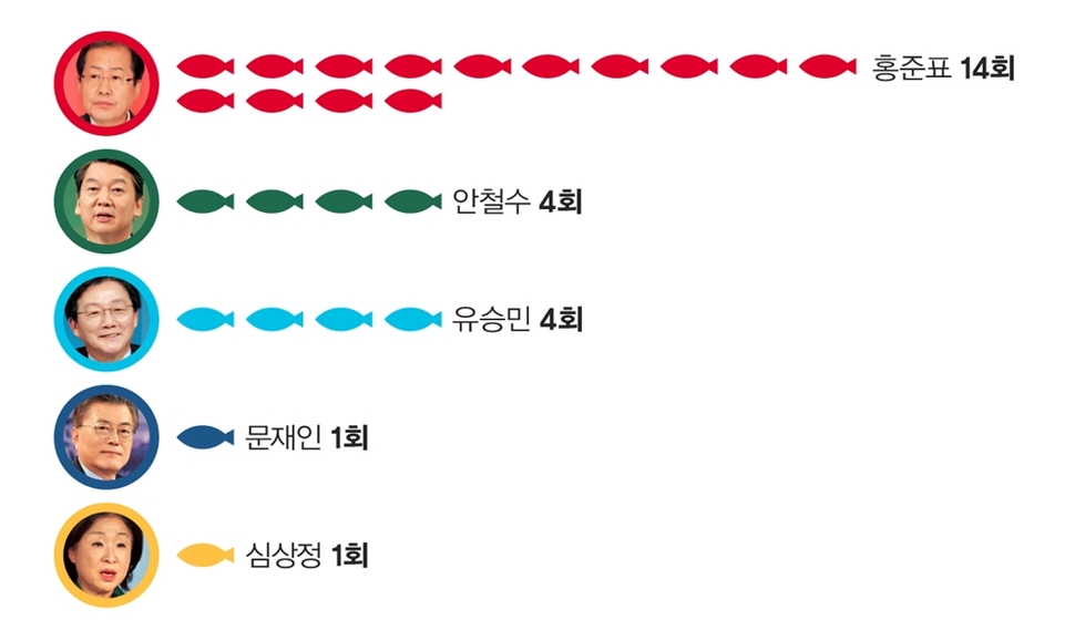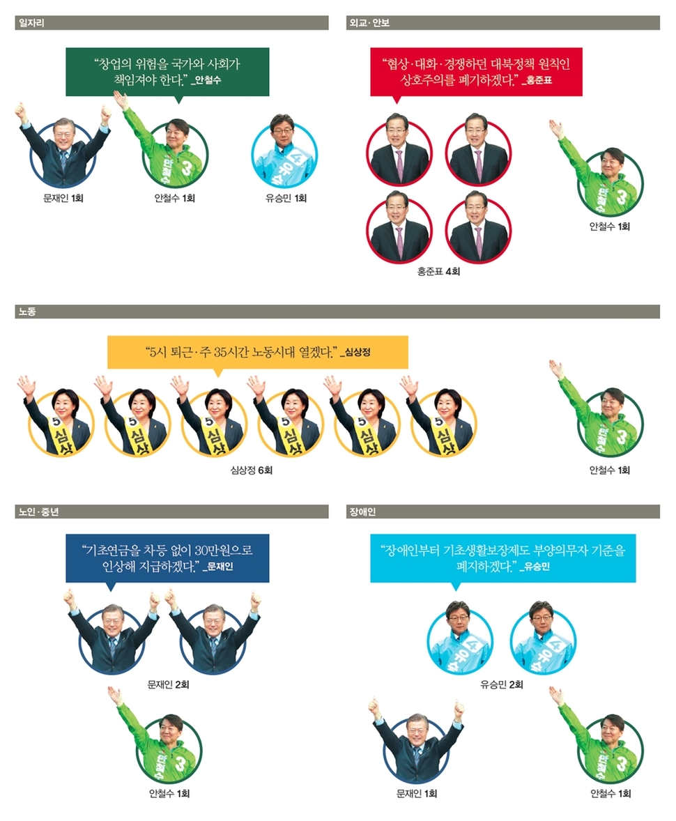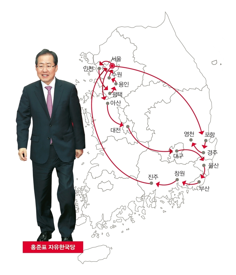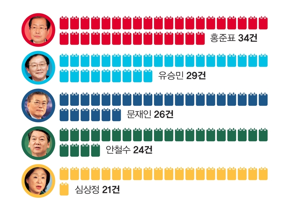 선택과 집중 전략을 취한 홍준표·유승민 후보가 가장 많은 일정을 소화했다. 문재인·안철수 후보처럼 광역 시·도 단위로 폭넓게 옮겨다니는 대신 광역 시·도 인근 지역들을 훑은 결과다. 그중에서도 흙수저 출신의 ‘당당한 서민 대통령’을 내건 홍 후보는 전통시장을 하루 평균 세 번씩 방문했다.