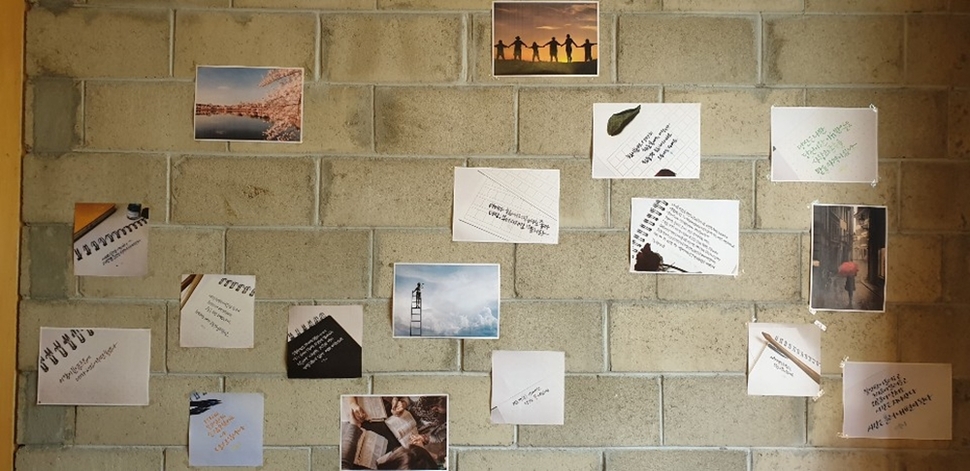 경기도 수원 행복한우리동네의원 카페(우리가 꿈꾸는 동네) 벽면에 심리적으로 고통받는 아이들을 응원하는 사진이 붙어 있다.