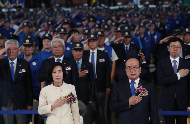 7월18일 서울 잠실 실내체육관에서 열린 ‘고엽제의 날’ 행사에 참석한 피우진 국가보훈처장. 오른쪽은 황규승 대한민국고엽제전우회 회장. 연합뉴스