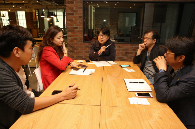 김완 <한겨레21> 디지털 팀장, 김양희 <한겨레> 스포츠부 기자, 이완 <한겨레21> 기자, 정윤수 스포츠 칼럼니스트, 정용철 서강대 교수(왼쪽부터)가 지난 10월2일 서울 마포구 미디어카페 후에 모여 올해 프로야구에서 가장 뜨거웠던 화제인 김성근 한화 감독에 대해 이야기를 나누고 있다. 류우종 기자