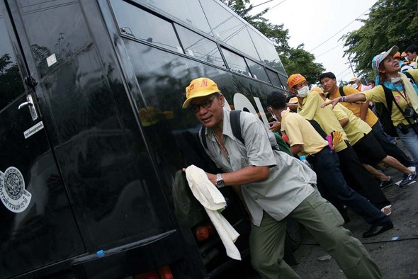 지난 10월7일 방콕 시내 중심가에서 PAD 시위대와 경찰 간 충돌이 격화하면서 곳곳에서 유혈사태가 벌어졌다. 시위대 일부가 거리에 세워진 경찰 차량을 밀어내고 있다.