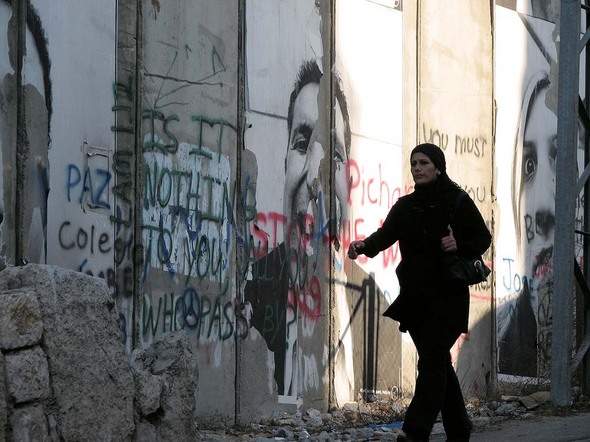 팔레스타인 땅 요르단강 서안의 베들레헴에서 한 여성이 이스라엘군이 세워놓은 거대한 분리장벽을 따라 걷고 있다. 유대인 정착촌을 따라 장벽이 차곡차곡 들어서면서 팔레스타인 땅은 조각조각 섬처럼 고립되고 있다.