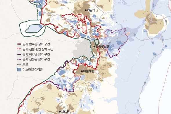어린 시절 즐겨하던 ‘땅따먹기’ 놀이가 떠올랐다. 팔레스타인에선 놀이가 아니라 현실이다. 정확히 말해 힘이 센 쪽이 일방적으로 벌이는 ‘땅 빼앗기’다. 요르단강 서안지구 곳곳에 ‘유대인 정착촌’과 이스라엘 땅을 잇는 도로가 건설되고, 정착민 보호를 명분으로 성벽을 둘러친다. 팔레스타인 땅 서안지구는 조각으로 흩어진 채 섬처럼 고립되고 있다. 벌써 여러 해째다.