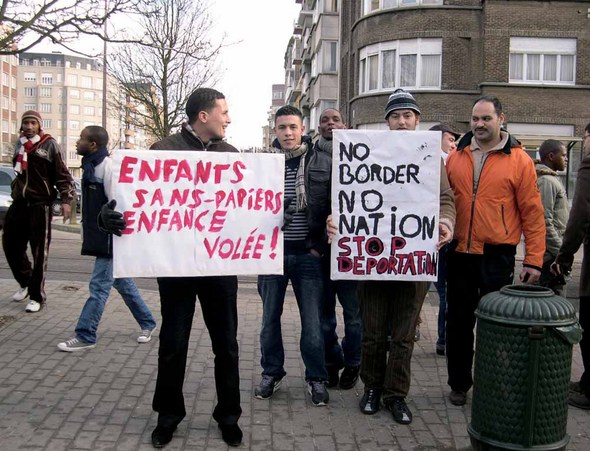 “국경 NO, 국적 NO, 추방을 멈춰라!” 불법체류자인 상파피에들이 12월14일 벨기에 브뤼셀의 브뤼셀자유대학 교정에서 구호가 적힌 팻말을 들어 보이고 있다.