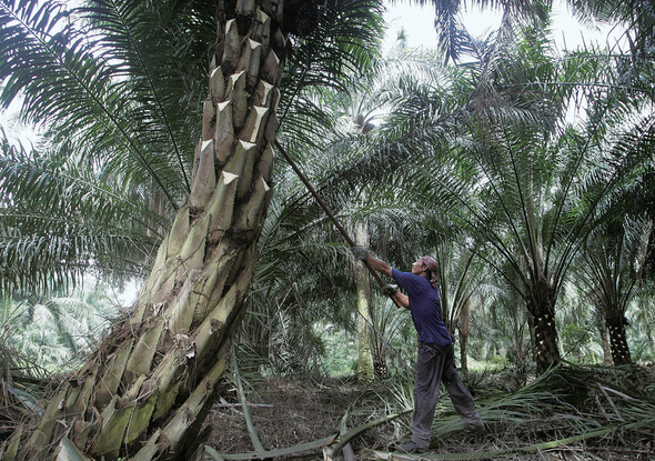 말레이시아 쿠알라룸푸르 인근의 기름야자 농장에서 한 노동자가 야자열매를 따고 있다. REUTERS/ ZAINAL BDB HALIM